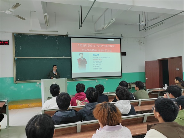 为弘扬劳模精神与工匠精神,11月6日,我院在教学楼101教室举办了“劳模进课堂”活动。活动特邀安徽江淮汽车集团股份有限公司电工高级技师、合肥市劳动模范崔玉顺,崔玉顺以“劳动托举梦想,奋斗书写华章”为主题,为机械工程系百余名师生带来一场主题鲜明、内容生动的精彩讲座。