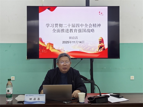 为深入学习贯彻党的二十届四中全会精神,准确把握“十五五”时期党和国家事业发展蓝图,统一思想、凝聚共识,推动学院事业高质量发展,11月14日下午,学院党委书记田启昌同志以《学习贯彻二十届四中全会精神 全面推进教育强国战略》为题,为全院党员讲授专题党课。